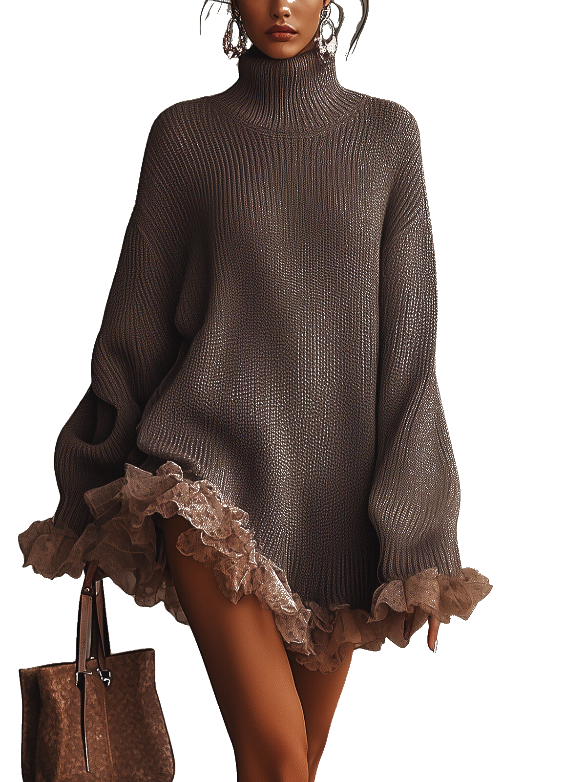 Une robe pull ultra-douce avec une touche romantique. Sa coupe oversize, son col montant élégant et ses délicats volants en bas créent un look chic sans effort — cosy, féminin et parfait pour les journées fraîches où l’on veut rester stylée tout en étant confortable.